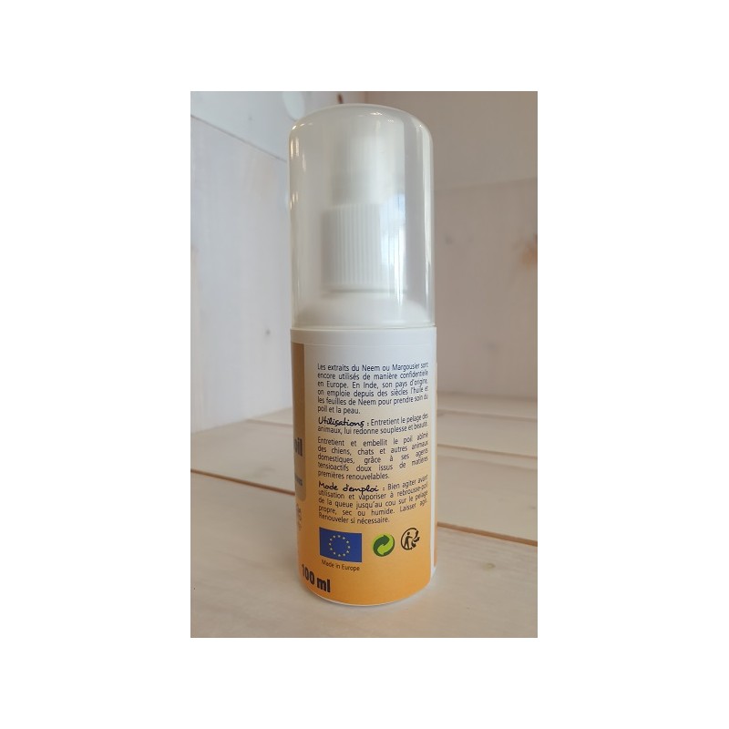 Ce spray entretien et embellit le poil abimé des chiens , chats et autres animaux domestiques , grâce à des agents tensioactifs doux issus de matières premières renouvelables .